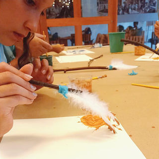 Experiências com tintas e pincéis naturais, da confecção a criações de pinturas pensando composições visuais a partir de rastros, manchas e formas. Uma proposta de encontro entre crianças e familiares onde a exploração criativa através da linguagem das artes visuais e experimentação dos desdobramentos possíveis de materialidades naturais para criar descobertas de pensar o desenho e a pintura de forma expandida.